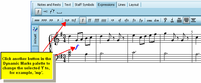 Using the Palettes to Edit Music Symbols and Text In Select Mode, use the third-level (detail) palette to edit music symbol or text you have selected.