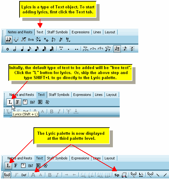 Keyboard Shortcuts for Palettes In Add Mode, you can quickly navigate a third level palette with a keyboard shortcut, which is SHIFT+{letter}, such as SHIFT+L for the Lyrics palette. You can learn the SHIFT+{letter} shortcut for a palette by holding the mouse over the second-level palette button for that third-level palette, as illustrated in the above example for the Lyric palette. Note, some palettes share the same SHIFT+{letter} shortcut. For example, the shortcut for the Rehearsal Mark palette and the Rest palette are both SHIFT+R. If you type SHIFT+R and the wrong palette comes up, just type SHIFT+R a second time. We figure it is easier for you to type SHIFT+R twice than it is to type something like CTRL+SHIFT+R, which is both difficult to type and difficult to remember.